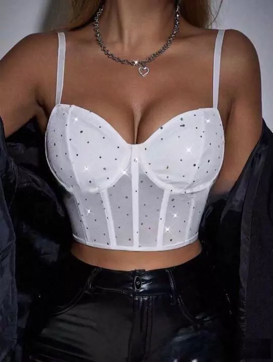 Bustier negro con detalles birllantes y tela semistransparente, ideal para un look nocturno elegante y sofisticado. Perfecto para combinar con jeans o faldas, es una prenda versatil para cualquier ocasion especial.